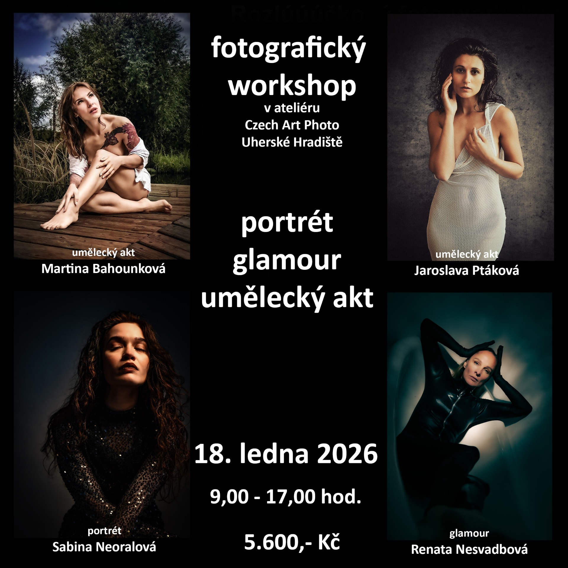 CENA 5.600,- Kč obsahuje: modeling - 4 modelky (2x aktová modelka, 1x glamour modelka, 1x portrét modelka), oběd, coffee break doplední a odpolední , nealko nápoje + káva + čaj neomezeně v průběhu celého dne